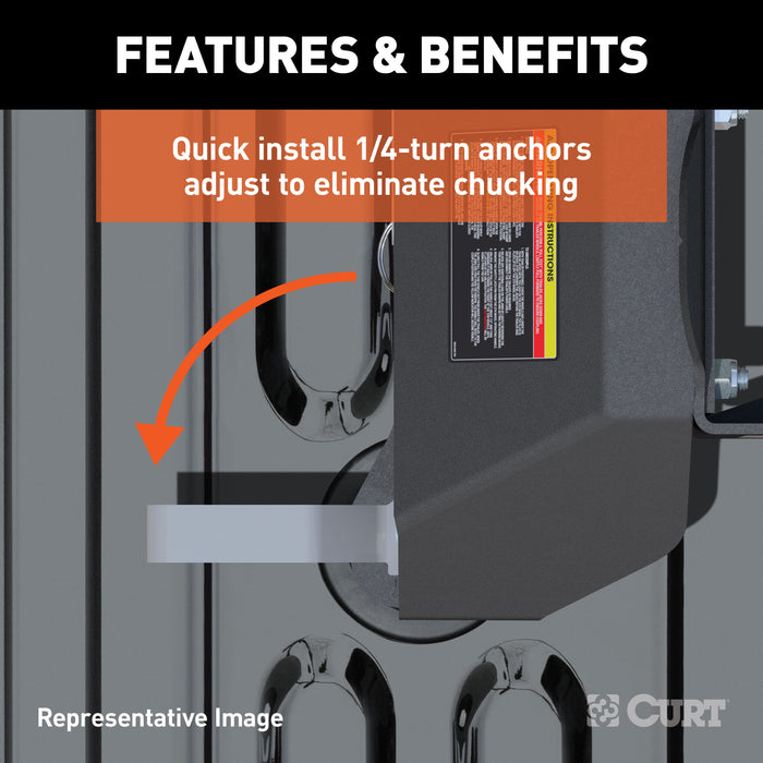 | Description_MKT | With a gross trailer weight capacity of 24,000 lbs., the CURT Q24 5th wheel hitch is capable of towing some of the heaviest 5th wheel trailers, while still offering a smooth, quiet ride. Instead of pivoting of two axes, the Q24 is built with a spherical bearing that allows the hitch head to pivot in virtually any direction. This means smoother turns, a quieter ride and less strain on your towing equipment and truck. The Q24 also features dual-locking jaws for 360-degree kingpin contact and three grease fittings for continuous lubrication. The Q24 5th wheel hitch also makes coupling easier with its self-aligning head, single-handle operation and three-position coupling indicator. While the self-aligning head helps reduce errors when backing up to the kingpin, the coupling indicator eliminates the need for you to get in and out of the truck cab to check the kingpin connection. The indicator is visible from the cab of the pickup and shows the exact status of the coupling point. For long-lasting protection against the elements, this 24K 5th wheel hitch is finished with a highly durable carbide black powder coat. This particular Q24 hitch comes with a set of CURT OEM puck system 5th wheel legs, designed to be mounted on a Ford long-bed pickup with the truck bed puck system. Using a set of quarter-turn anchors, the legs quickly and easily drop into the pucks, instantly mounting the Q24 hitch and equipping the truck for 5th wheel towing. The anchors feature an adjustable design to perfectly lock the hitch into place and eliminate any chucking noises, and the legs are finished in a durable carbide black powder coat to be highly resistant to scratches, rust and UV damage. These legs are only intended to fit the Ford puck system and cannot be installed without it. Certain turret-style pin boxes, such as Sidewinder, are not compatible with CURT Q-series hitches and should not be used as they may create vehicle / trailer handling hazards. |