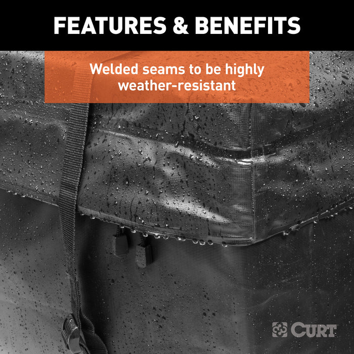 | Description_MKT | CURT cargo bags are the ideal way to keep your belongings well protected from water, dirt, road grime and even wind damage, all while being easy to manage and perfectly fitted for a CURT cargo carrier or roof basket. Unlike other cargo bags that use a thin vinyl material, our cargo bags are made from a thick UV-resistant vinyl and have welded seams to be highly water-resistant. Thick, 1" wide polypropylene straps keep the bag firmly attached to the carrier and ensure your belongings will not jostle around. This CURT cargo bag comes with a heavy-duty zipper that wraps 1/2 way around the bag and hook-and-loop flaps to keep the zipper completely covered and the inside of the bag dry. For a little extra security, the zippers are able to be joined together and feature large holes to accept a padlock. This particular CURT cargo bag offers 13.5 cu. ft. of storage area and is a perfect fit for the CURT roof-mounted cargo basket. All of our cargo bags are easy to fold up for compact storage and come with a limited lifetime warranty. |