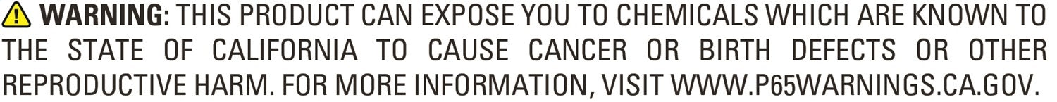 | WARNING CA Proposition 65 Message | WARNING: This product can expose you to Lead; which is known to the State of California to cause cancer or birth defects or other reproductive harm. For more information; visit www.P65warnings.ca.gov. |