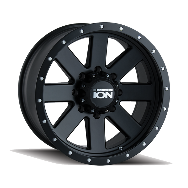 | BULLET POINTS | BOLD BUT TIMELESS 8 SPOKE DESIGN; ENHANCED WITH OUR PATENTED HSL (HIGH STRENGTH LIP) TECHNOLOGY TO ENDURE ALL TERRAIN CONDITIONS; LIP RIVETS WITH "ION" LOGO GIVE A PREMIUM LOOK; INDUSTRY LEADING LOAD RATINGS UP TO 3,640 POUNDS PER WHEEL WITH 40” TIRES; AVAILABLE IN MATTE GUNMETAL WITH BLACK LIP OR FULL MATTE BLACK FINISHES; SIZING AVAILABLE IN 17X8.5, 18X9, 18X10, 20X9 AND 20X10 |