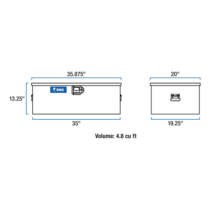 | Description_MKT | UWS foot lockers provide unbeatable storage and security for your items, whether in the shop, at home or on the job. Each box features a corrosion-resistant aluminum construction, a highly secure stainless steel locking system and a RigidCore foam-filled lid - all to keep your equipment and valuables safe, well-organized and easily accessible whenever needed. This UWS foot locker box is constructed from extra-thick aluminum for increased structural strength. The tub is welded together into a single piece for weather resistance and to easily hold heavy tools and other items. The lid features a RigidCore foam-filled design, sandwiched between two aluminum plates. This greatly increases the strength of the lid and helps prevent bending and warping, making operation very smooth. The locking mechanism of the UWS foot locker provides excellent security for your items, featuring a stainless steel, key-operated paddle handle. Stainless steel construction supplies the lock with long-lasting corrosion resistance, and the lid also has a MicroSeal gasket, blocking moisture, dust and insects from getting inside and damaging your valuables. The lid also opens a full 90 degrees for easier access, and it is equipped with self-opening struts for convenient operation when your hands are full. Like all UWS products, each one is proudly assembled right here in the USA for style and long-lasting dependability. This product is heavily packaged for parcel shipping. |