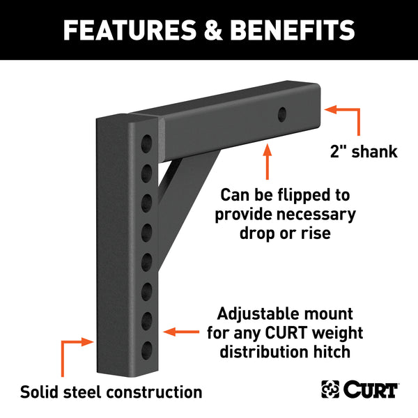 | Description_MKT | When it comes to enjoying your passion, we think towing equipment should never be the limiting factor. This CURT weight distribution replacement shank is designed for heavy-duty towing, versatile adjustment of your weight distribution hitch and long-lasting reliability. Made from high-strength steel and tested for safety, this WD replacement shank is perfect for a variety of tough jobs and long journeys. It is compatible with all CURT weight distribution hitches and has a 2" shank with a 5/8" hitch pin hole to fit any 2" x 2" receiver tube opening with a 5/8" hitch pin hole, including most CURT class 3, class 4 and Xtra Duty class 5 trailer hitches. While the receiver tube shank measures 2" x 2", the vertical shank offers a universal fit to be compatible with all CURT weight distribution hitches. Holes in the vertical shank are spaced 1-1/4" center-to-center and have a 3/4" diameter, allowing for flexible adjustment of the WD head for precise leveling of the vehicle-trailer combination. This weight distribution shank can be positioned in the rise position for a maximum rise of 8-7/8" or flipped into the drop position for a maximum drop of 5-5/8". To ensure durability and long-lasting use, CURT weight distribution replacement shanks are constructed from solid steel and shielded with a highly durable carbide black powder coat finish. This protects them from rain, snow, dirt, road salt and much more for lasting corrosion resistance. |
